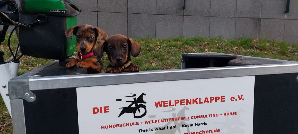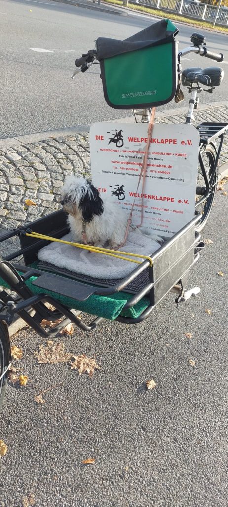 Das Rad ist mit meinem Namen und Werbung bedruckt. Jeder soll wissen wie die “Welpenklappe München e. V.” arbeitet und sehen, wie schön es sein kann, mit Hunden unterwegs zu sein. Ich liebe Hunde und zusammen mit ihnen im Freien zu sein.