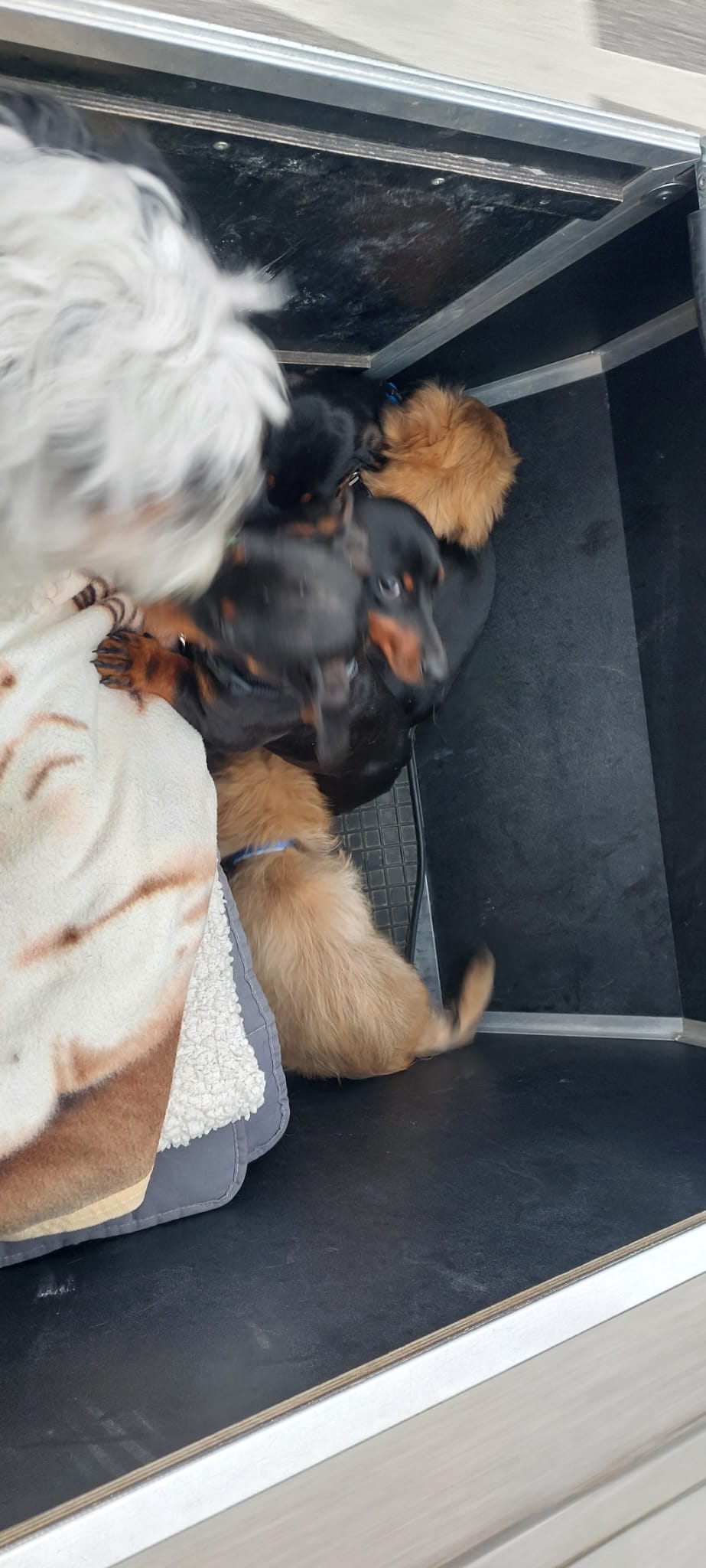 Die beiden schlafen in der Box, die Tür ist offen und alles ist ruhig. Ich selbst habe Zeit zum Staubsaugen und anderer Haushaltsarbeit. Ich lasse sie alleine in der Wohnung und alles ist wunderbar.