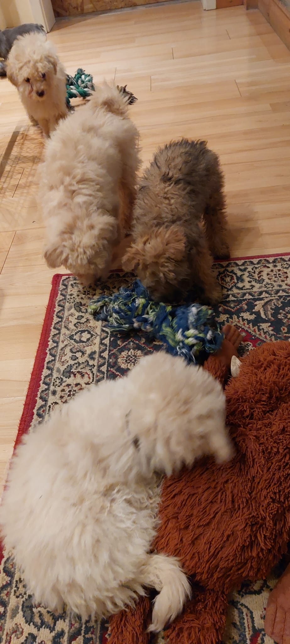 Die Welpen sind nach einer halben Stunde Spiel schon müde und eigentlich bereit für das Bett. Ich stehe ständig auf, verlasse das Zimmer, laufe hin und her. Die Welpen bleiben und sind ganz zufrieden, kauen an den Spielsachen und sind ziemlich ruhig.